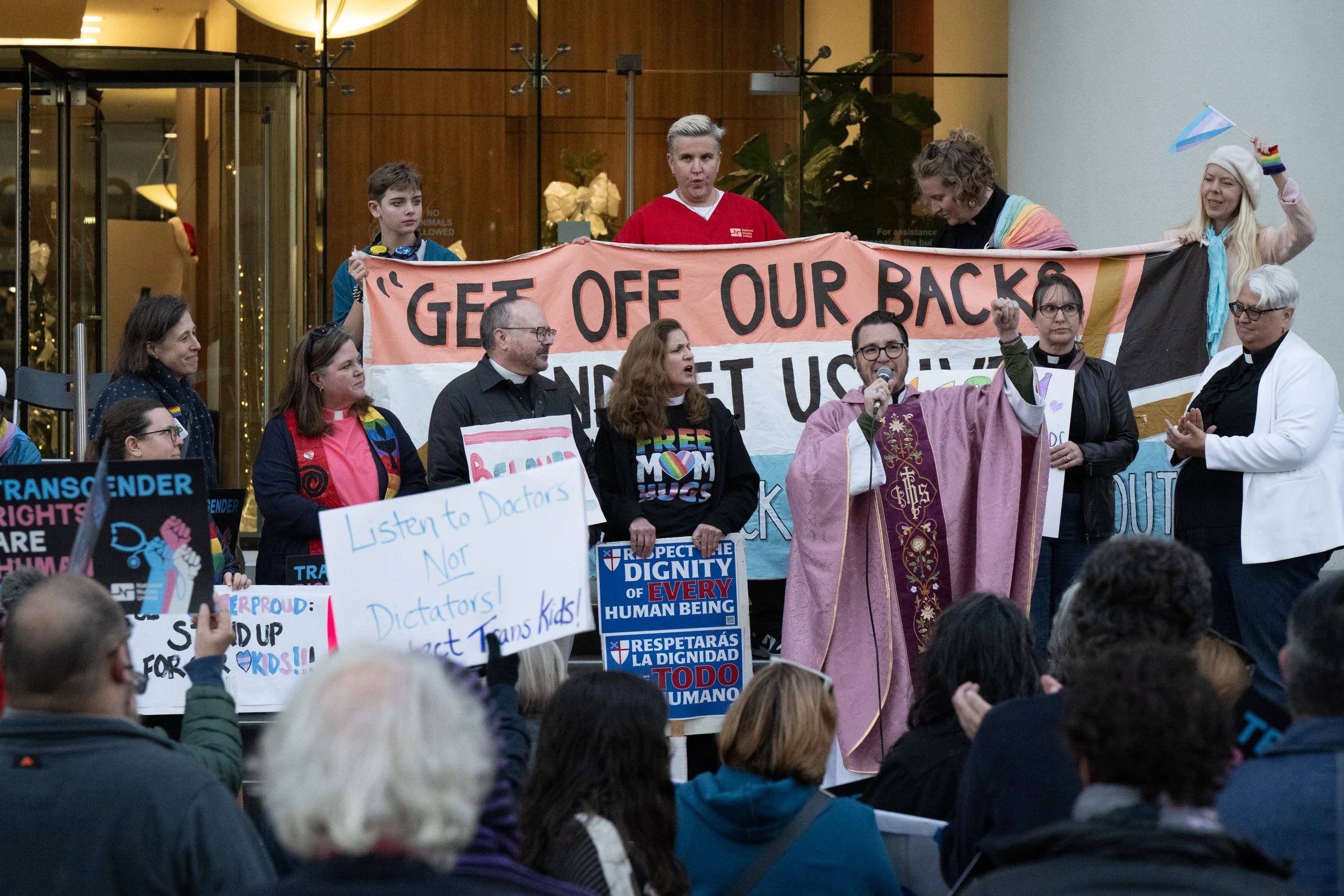 The rally was supported by community activist Honey Mahogany, along with local clergy, healthcare providers, representatives from Indivisible, Bay Resistance, the California Nurses Association, PFLAG, FUTR, and Jewish Voices for Peace, as well as scores of parents, caregivers and the trans youth whose care and well-being is under dire threat by such actions.