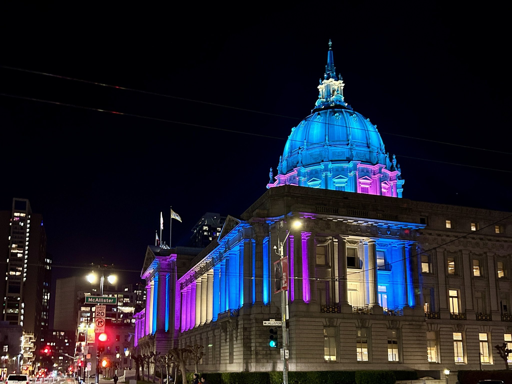 San Francisco City Hall lit up in trans flag colors on Feb. 2, following the passage of the resolution. Image credit: C Storm